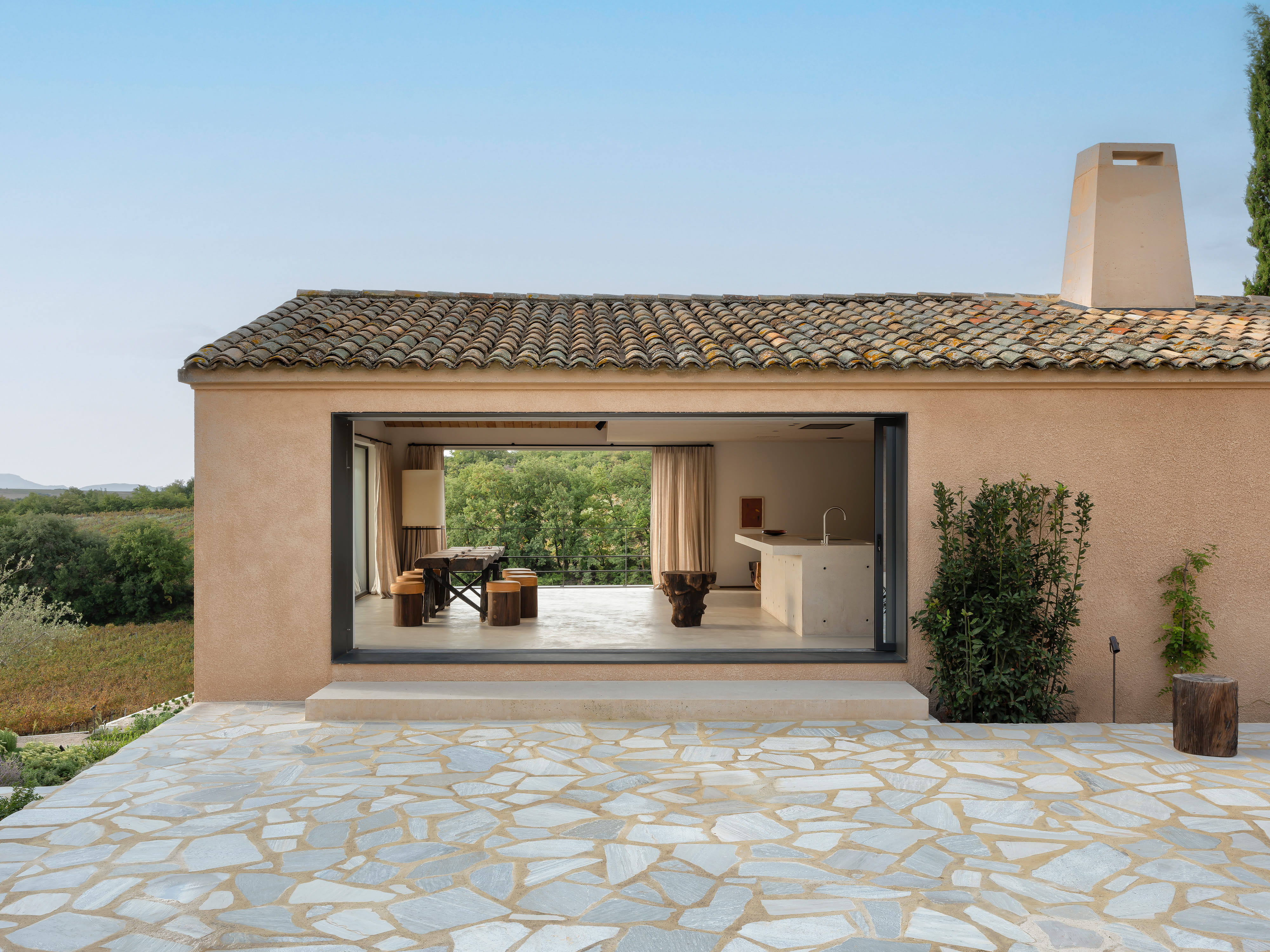 The real magic of this Provence property is the undisturbed views of the long stretched wine fields, trees, and mountains that are visible from every corner. With actual peace and quiet enveloping the property, it offers a serene escape from the bustle of everyday life. We took a thoughtful approach to transform the property, making interventions in the terrain, enlarging the facade openings, and creating additional connections between the buildings to further integrate it with the surrounding landscape. We removed garden walls to increase the relationship with the vineyards, ensuring that every corner of the property was immersed in the beauty of its surroundings. We crafted large concrete volumes to create terraces and intimate coveys, adding small pathways and hidden connections between indoor and outdoor spaces to create a sense of intrigue and a unique circulation experience.