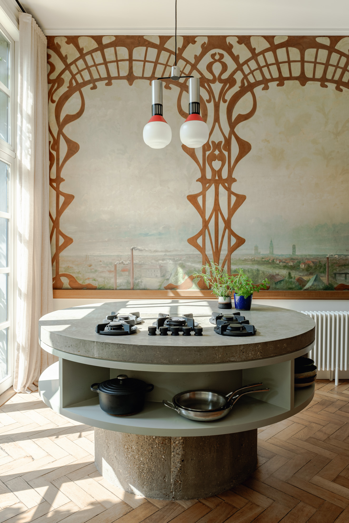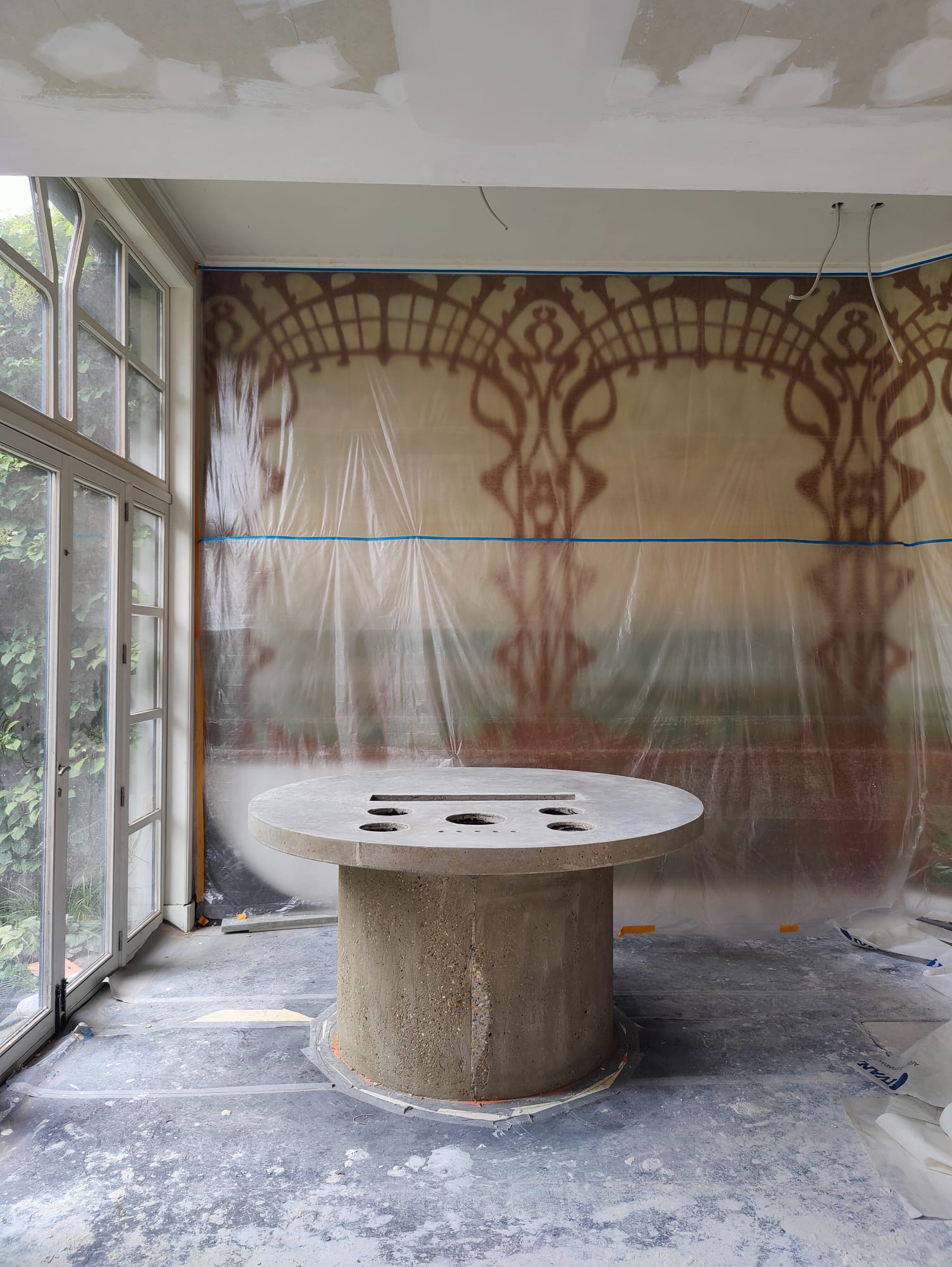 Every intervention was a dialogue between past and present. Rather than impose a new identity, we sought to collaborate with the house — allowing its few surviving features to guide the transformation. The design is mostly understated, letting the architecture breathe, with a few bold gestures introduced to re-anchor the home. One such intervention is a round concrete kitchen island — a sculptural centerpiece that sits opposite a hand-painted mural, the latter one of the home’s rare surviving artworks. Positioned in a light-filled space, the island offers 360° views of the adjoining rooms and staircase, making it both a practical and symbolic focal point.