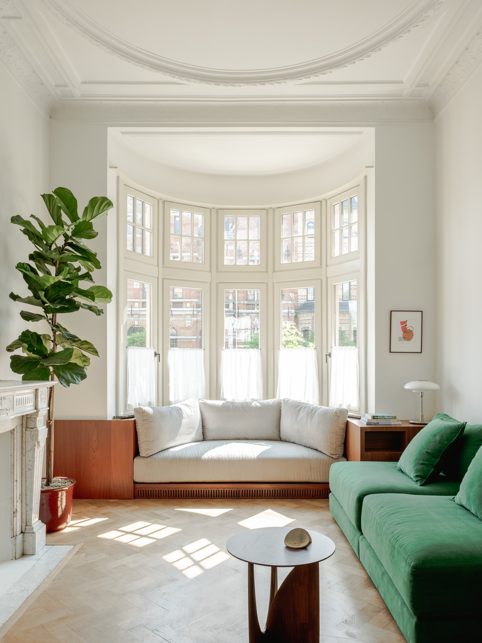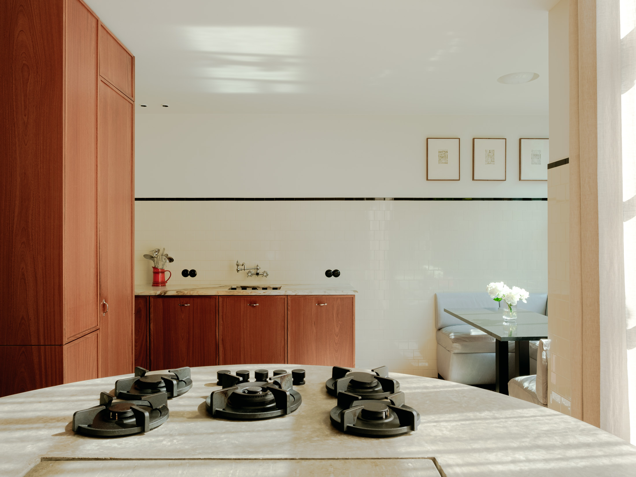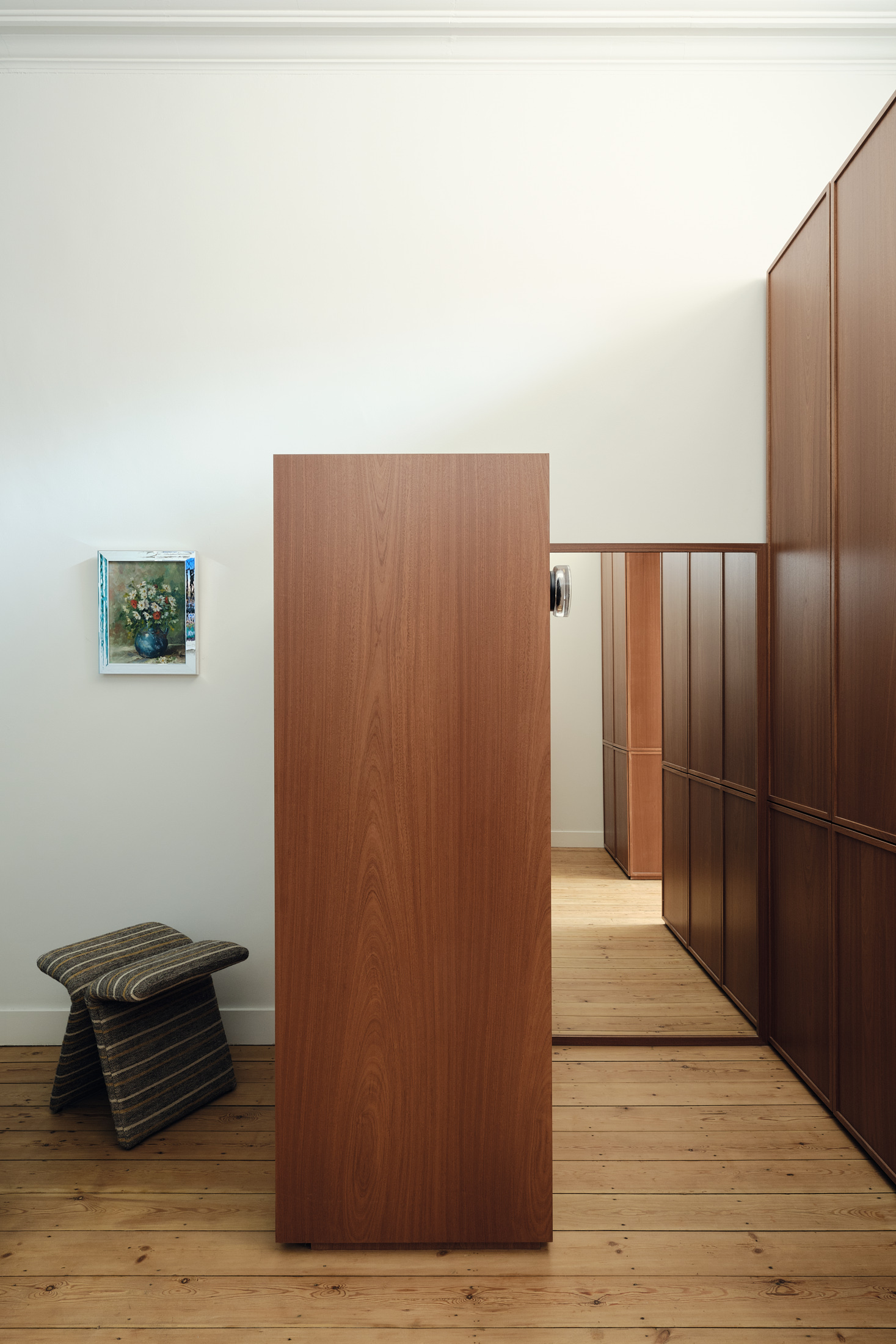 In an excisting bay window, we created custom built-in seating that flows into integrated shelving and storage. Executed in sapelli wood veneer, this rich material adds warmth and texture, while establishing a visual continuity that runs through the home. It reappears in the kitchen, where it is paired with an original terrazzo floor — a reminder of the building’s layered history. The kitchen itself unfolds in three parts: the central island, a built-in dining nook with a bespoke blue leather bench, and a functional wall with storage and sink. This layout supports both daily living and social cooking, emphasizing openness and ease of movement.