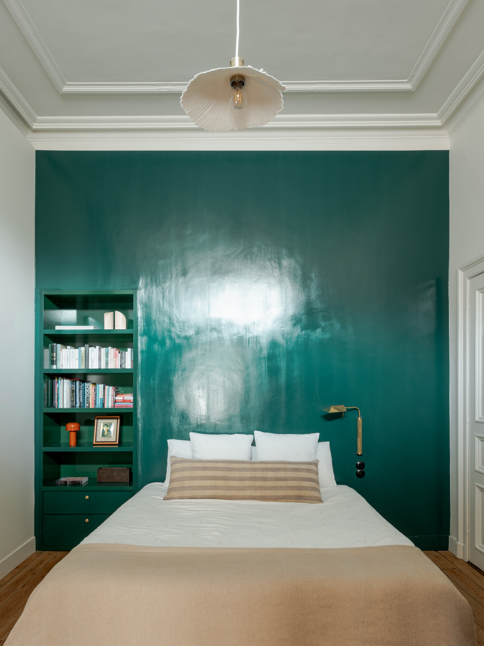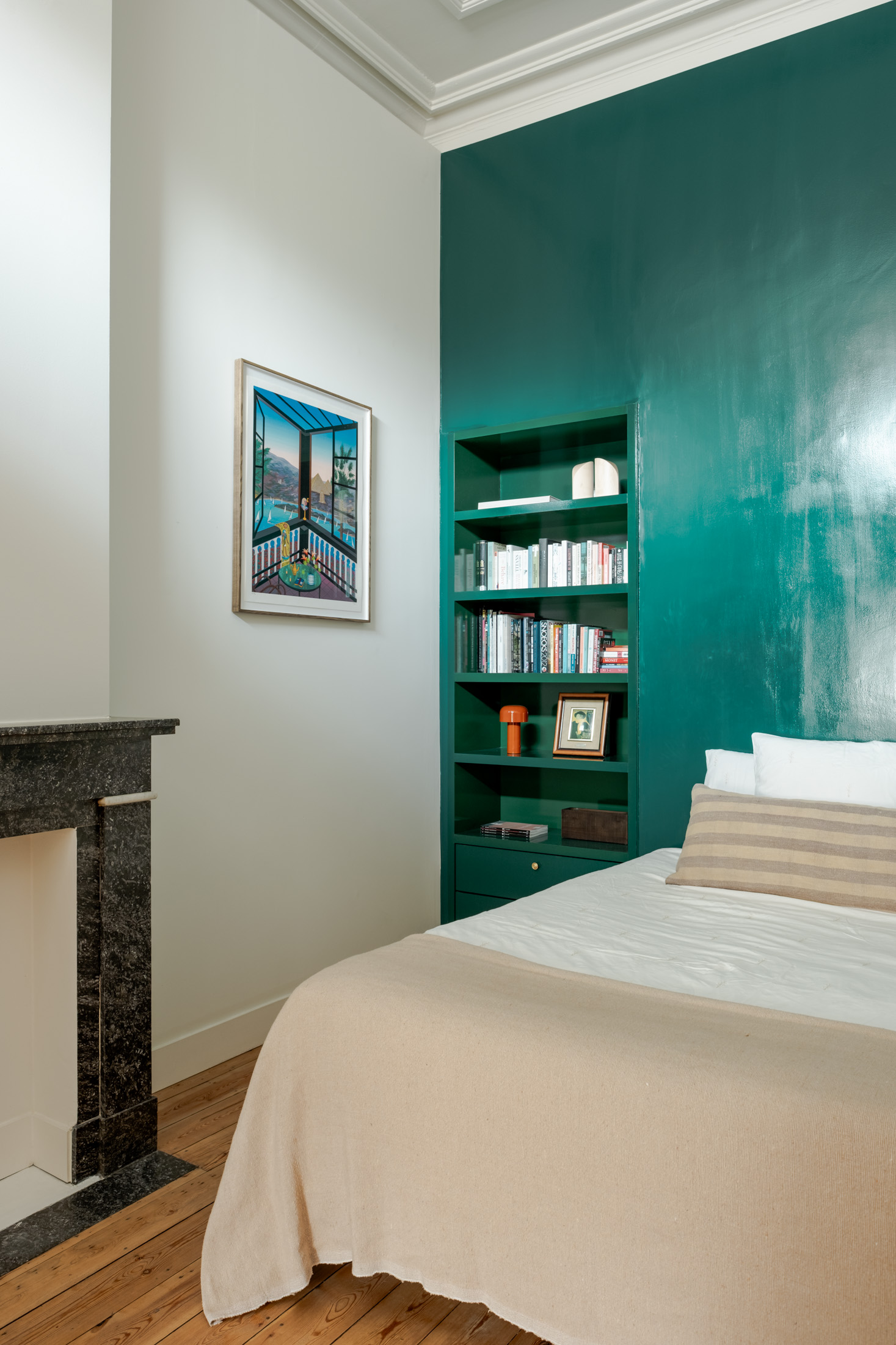 Beyond materiality, colour plays a conceptual role in the project. Each space introduces its own mood through unexpected but deliberate hues. In the master suite, a green lacquered wall and custom bookcase define the sleeping area, which connects via a sapelli-lined dressing to an en-suite bathroom. There, cream tiles wrap into a sunken shower, edged in high-gloss black that continues into shelving elements.
