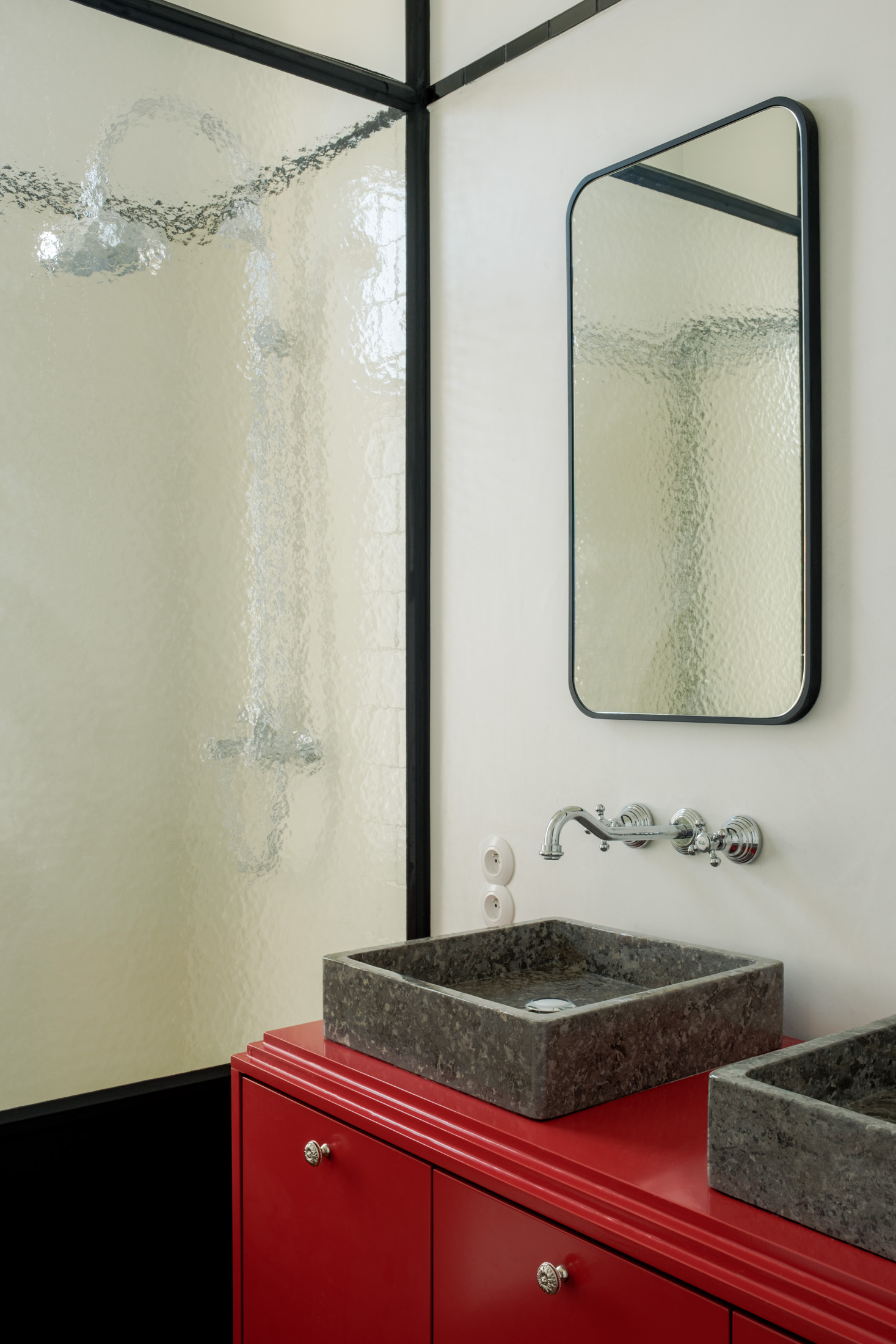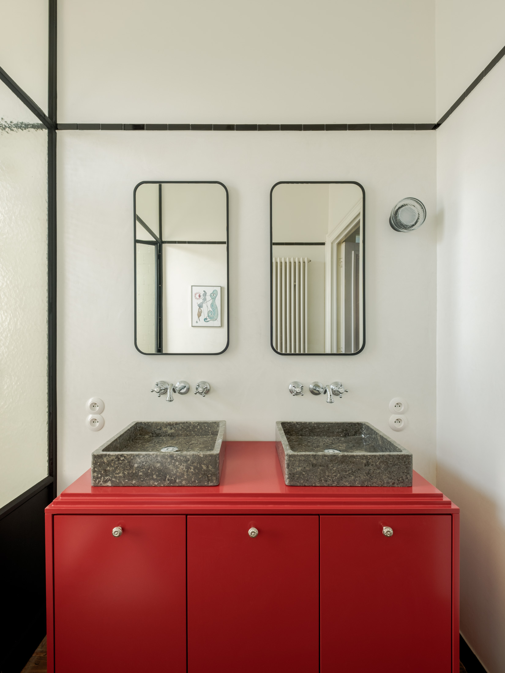 Elsewhere, colour becomes punctuation: a vibrant blue basin in the guest WC, red flooring in secondary bedrooms, a bright red vanity in the family bathroom. These moments of colour energize the overall palette and lend a sense of individuality to each space. Ultimately, this project is a case study in restraint and expression — a home reimagined not through contrast, but through considered continuity. By responding to the building’s spirit rather than rewriting it, we sought to restore a sense of belonging and quiet confidence to this period house.