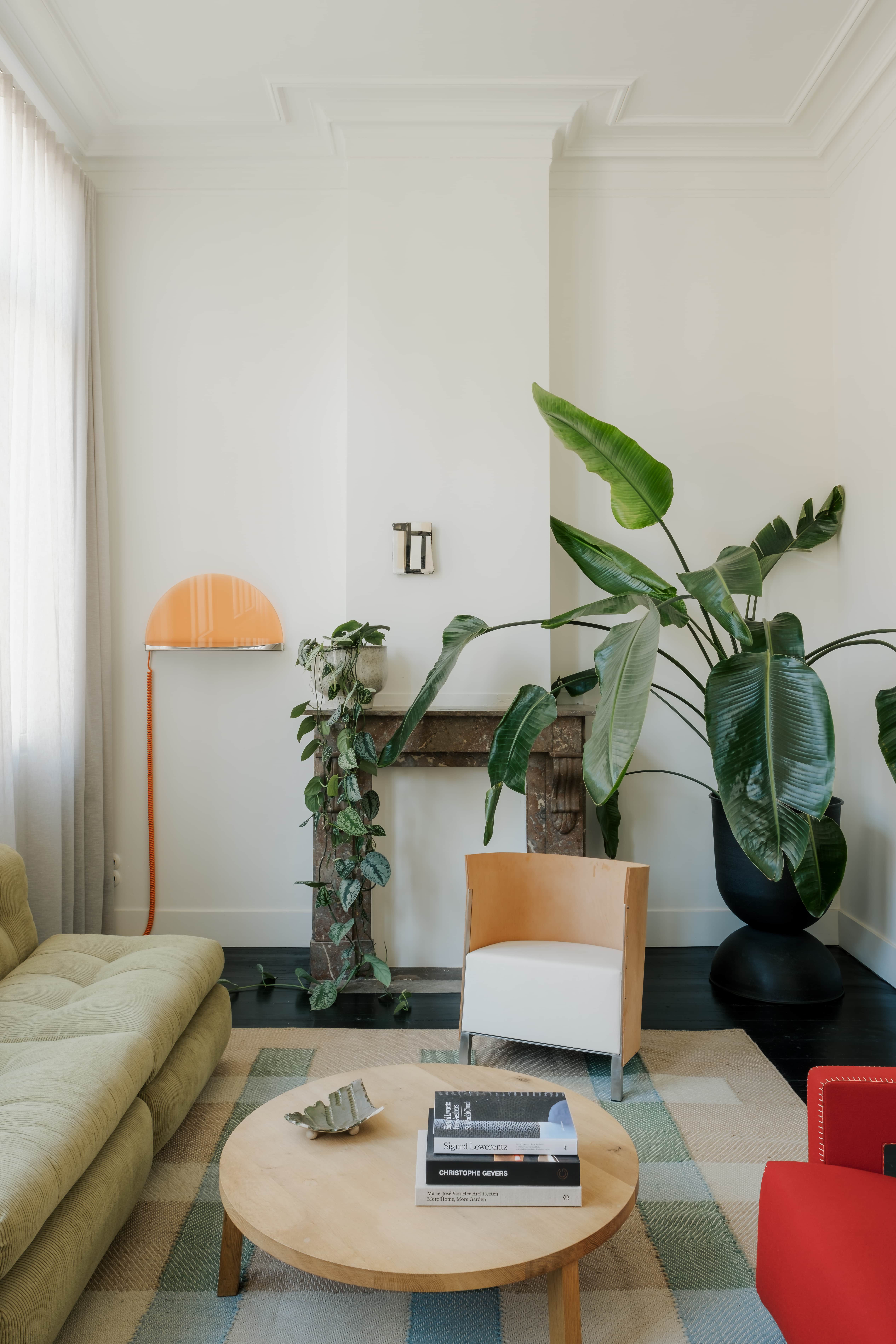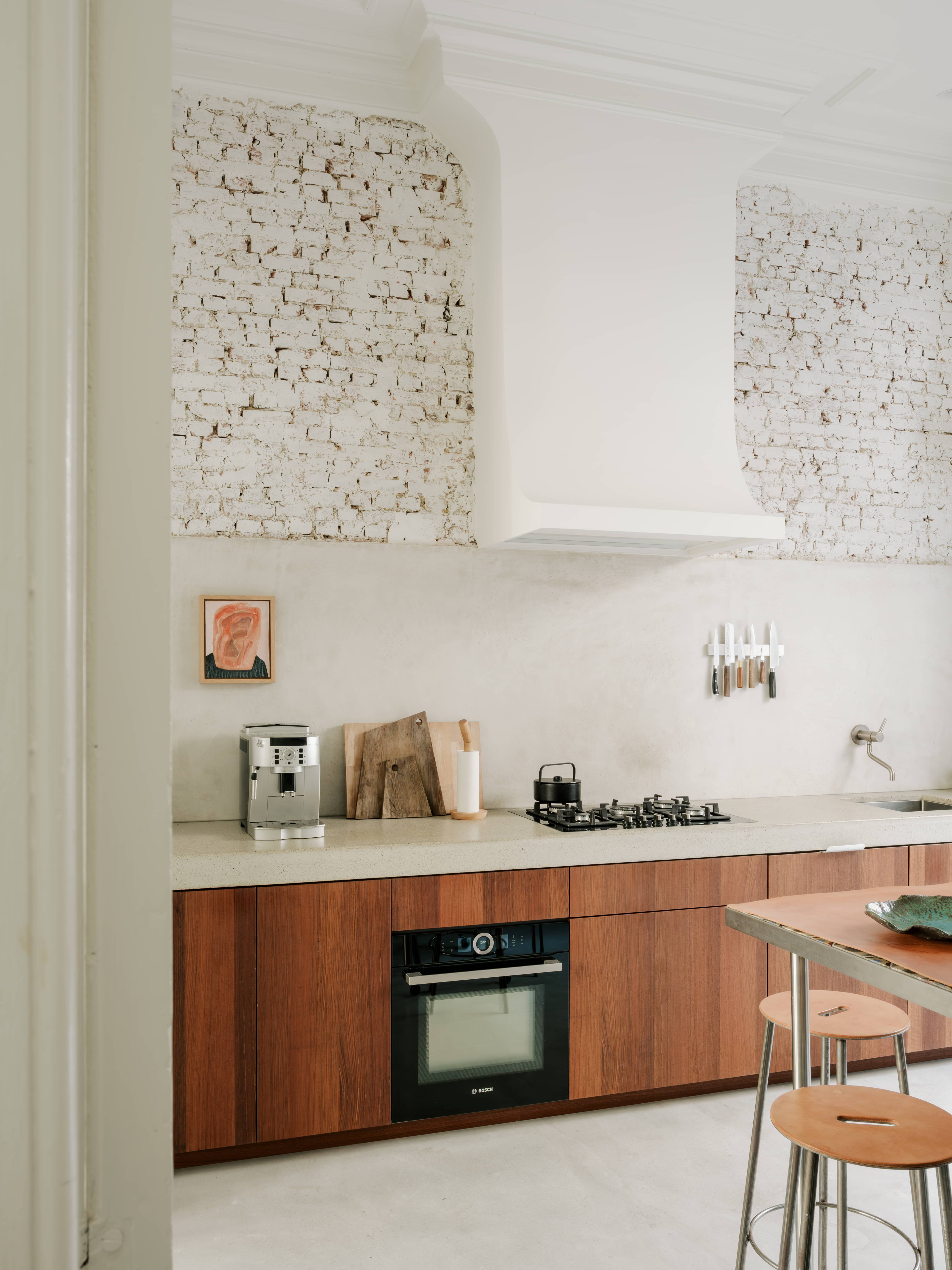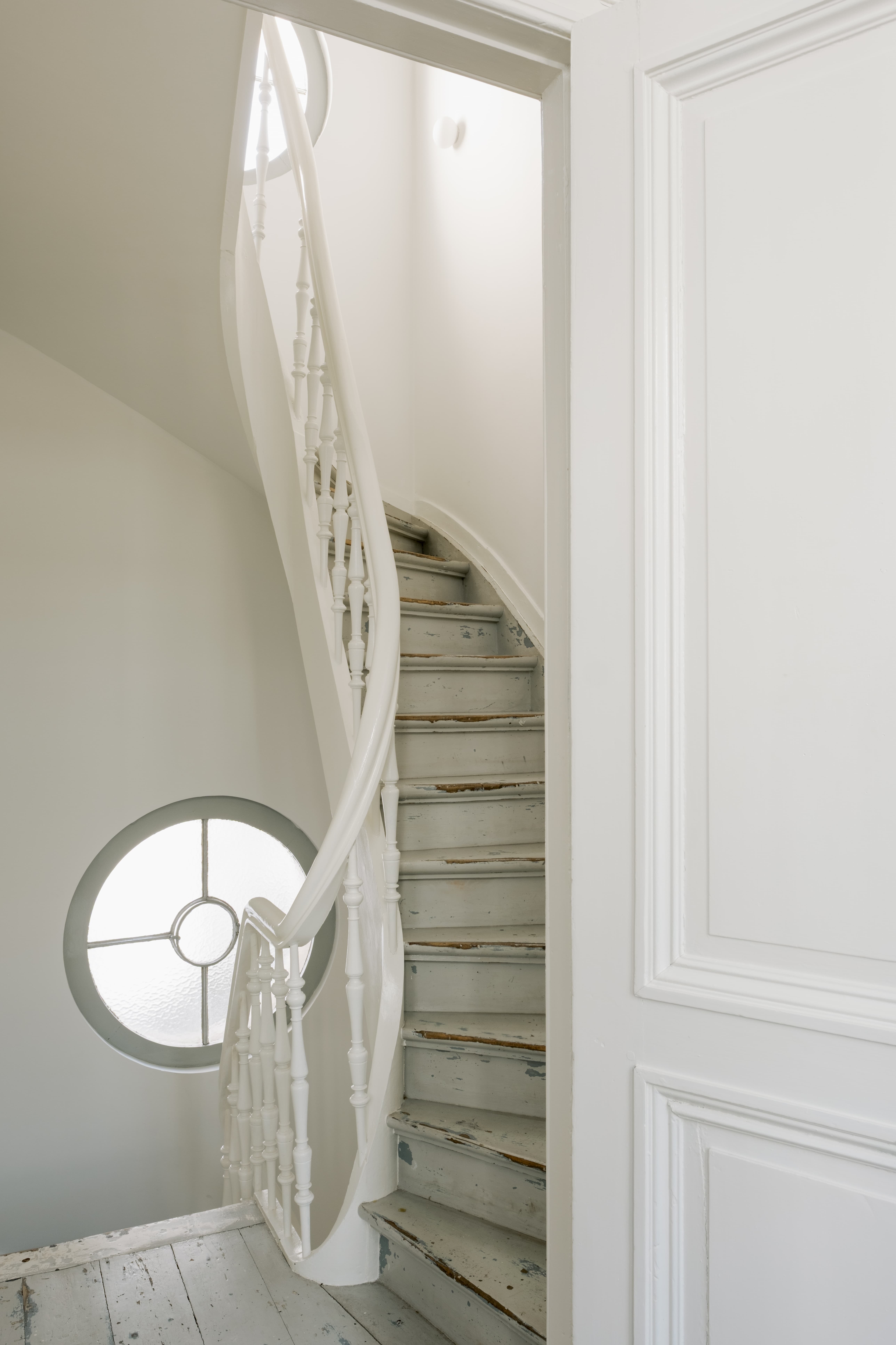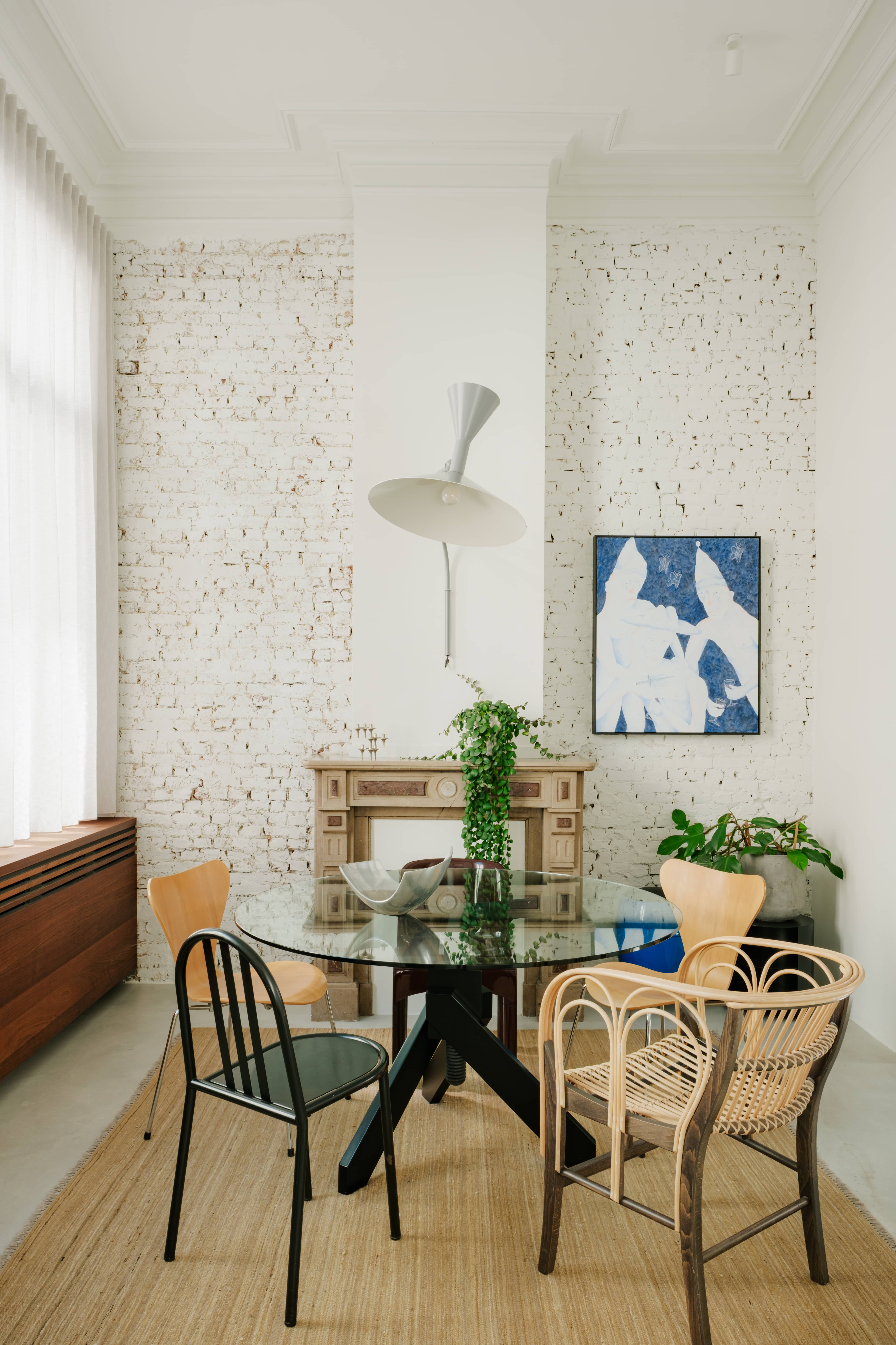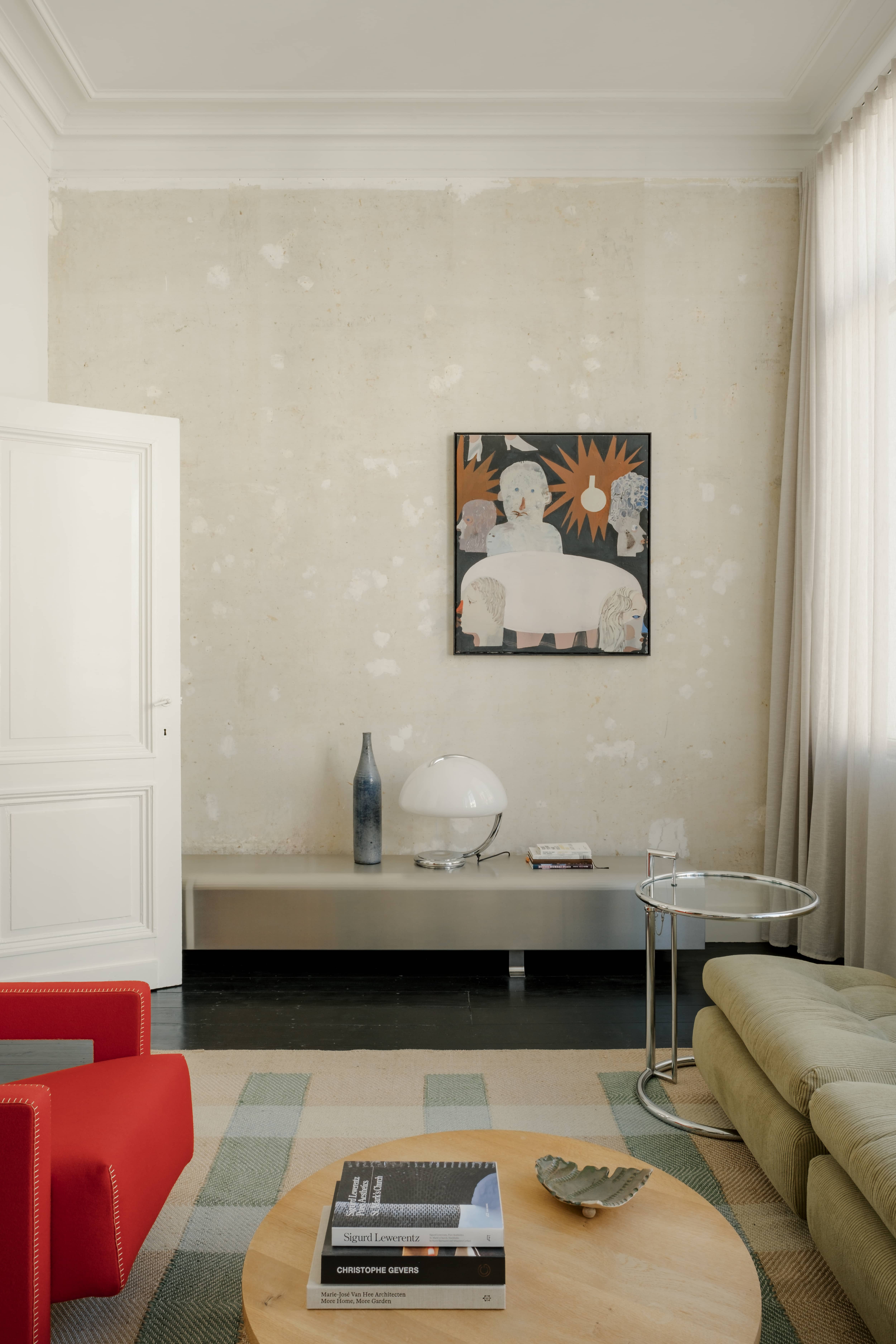 One of the standout features of this Antwerp townhouse renovation is how the exploration of contrast creates a compelling balance between historical, industrial, and playful elements. Worn stair treads were preserved in their patina and contrasted with a high-gloss white handrail, while a former fireplace mantel was dismantled and reinterpreted as a cooker hood, with exposed brickwork adding visual tension. Similarly, the refrigerator was clad in mirror finish and recessed into the load-bearing wall, allowing it to blend seamlessly into the overall shelving composition.