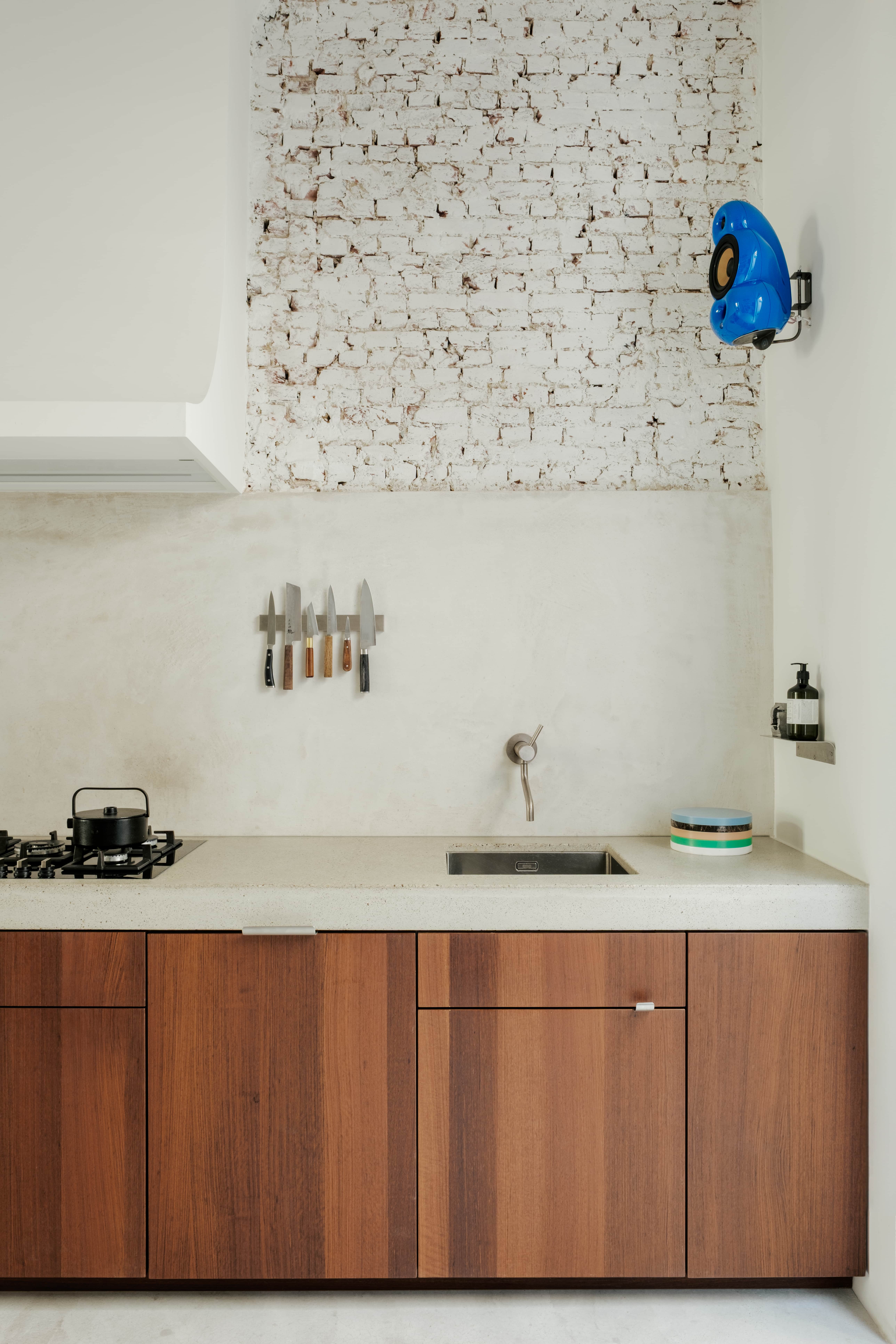 On the upper floor, housing the living and office areas, beautiful patinated walls were uncovered beneath the old wallpaper. Their contrast with the stainless steel convector casing and the amazakoué wood paneling in the office creates a compelling interplay of textures and materials.