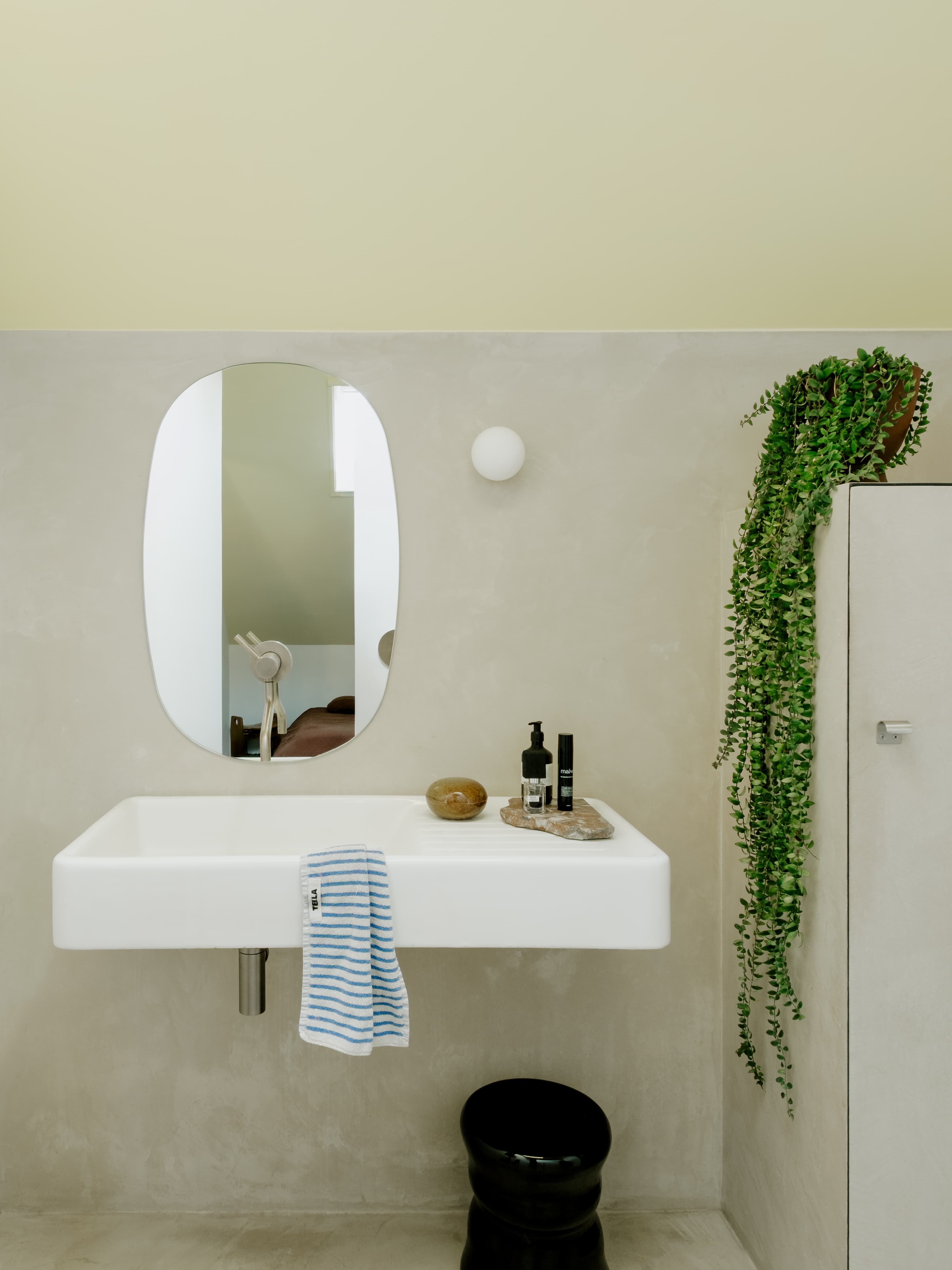On the top floor, two former bedrooms and their attics were fully removed to make way for an open-plan master bedroom and bathroom. The two functions are separated by a freestanding dressing unit, which does not reach the roof ridge, preserving the sense of volume in the space. The yellow ceiling adds a playful note to the spacious interior and, on summer days, contrasts beautifully with the blue sky through the newly installed, irregularly placed skylights.